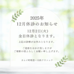 - 2025年12月休診のお知らせ12月2日(火)全日休診となります。